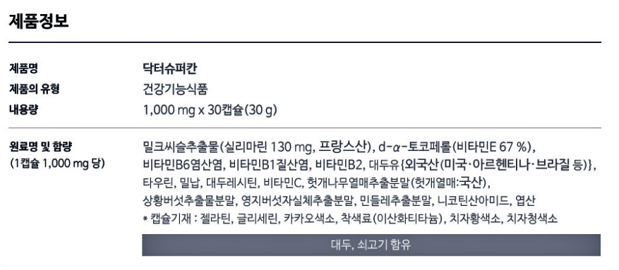여기에 헛개나무 열매 추출분말, 상황버섯 추출분말, 민들레 추출분말, 영지버섯 자실체추출분말, 타우린, 비타민C, 엽산 등 7종의 부원료까지 적절한 비율로 배합되어 하나의 캡슐로 간편하게 섭취가 가능한 닥터슈퍼칸입니다.