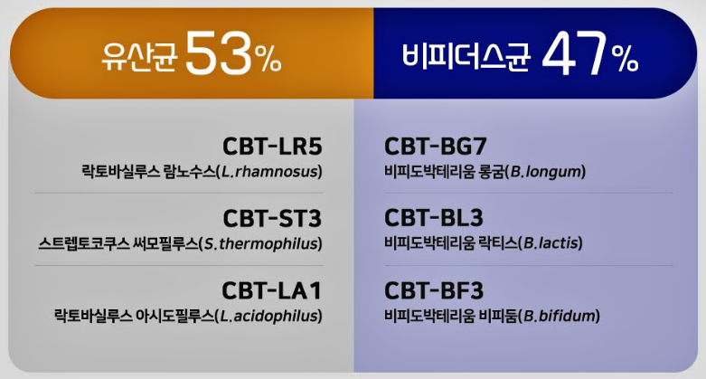 특허받은 CBT 균주 6종을 주원료로 하고, 프리바이오틱스, 비타민 A, C, E , B1, B2, B6 등 비타민 6종을 부원료로 하고 있습니다.
