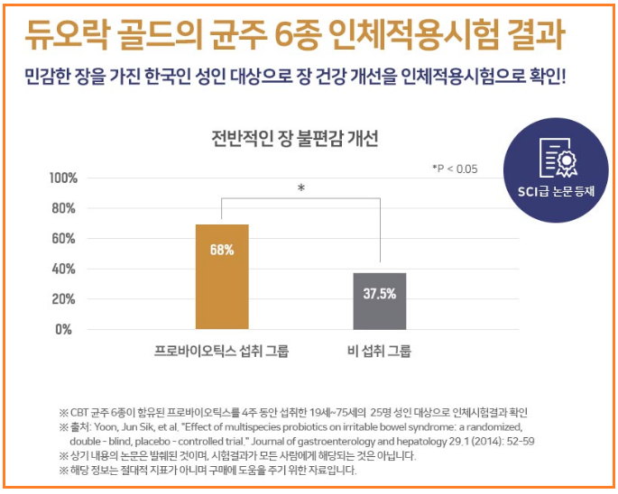 듀오락 유산균이 소비자들로부터 사랑을 받는 이유는 바로 100% 한국산 CBT 균주를 사용했기 때문인데요, 듀오락 골드의 균주 6종을 한국인 대상으로 인체적용시험 한 결과 피실험자들의 장 건강 개선이 확인되었다고 합니다.