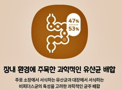 주로 소장에서 서식하는 유산균과 대장에서 서식하는 비피더스균의 특성을 고려해 최적의 비율로 균주를 배합하였고, 신바이오틱스 포뮬러로 유익균을 증대하여 장내 환경을 개선하는데 매우 적합한 제품입니다.