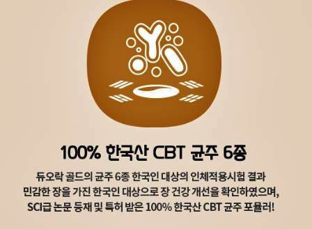 듀오락 유산균이 소비자들로부터 사랑을 받는 이유는 바로 100% 한국산 CBT 균주를 사용했기 때문인데요, 듀오락 골드의 균주 6종을 한국인 대상으로 인체적용시험 한 결과 피실험자들의 장 건강 개선이 확인되었다고 합니다.