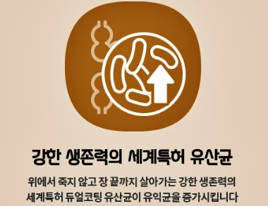 또한 장까지 도달하는데는 강한 생명력이 필요한데 듀오락 골드의 프로바이오틱스는 듀얼 코팅 방식을 사용하여 위에서 죽지 않고 장 끝까지 살아가는 강한 생존력을 자랑합니다.