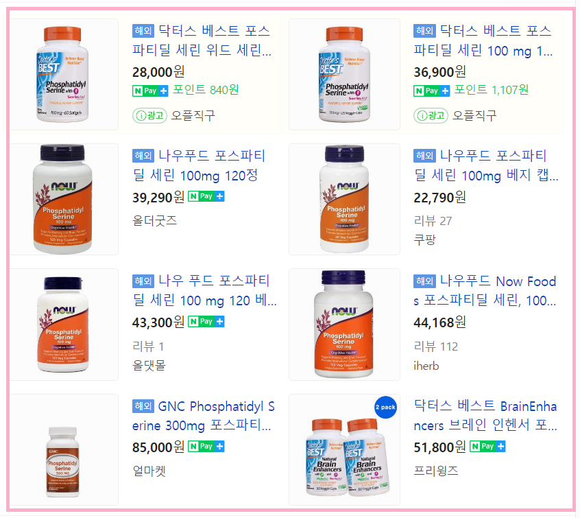 포스파티딜 세린 가격은 생각보다 저렴하게 판매되고 있는데요, 120정 기준으로 약 3만원 후반대에서 5,6만원 까지 다양한 가격으로 이루어져있습니다.
