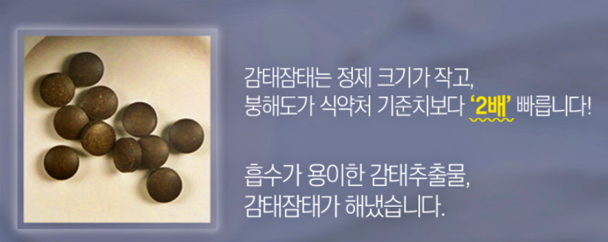 감태잠태는 정제 형태로 만들어져 있는데 크기가 매우 작고 식약처에서 권장하고 있는 붕해도 기준치보다 2배 빠른 붕해도를 자랑하고 있어 언제 어디서든 간편하게 섭취가 가능하고, 체내 흡수가 빠르다는 장점이 있습니다.