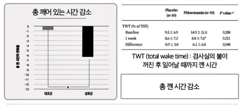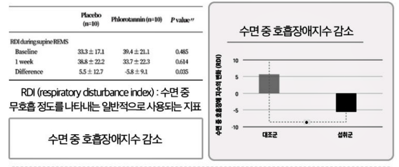 기능성 원료인 감태추출물의 인체적용시험이 있었는데, 1. 총 깬 시간 감소 / 2. 수면 지속 시간 증가 / 3. 수면 상태에서 호흡장애지수 감소 / 4. 잠든 후 깨어있는 시간 감소 등의 시험 결과가 있었습니다.