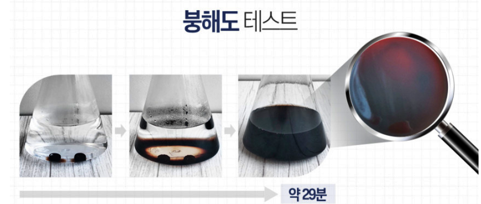 여기서 말하는 '붕해도'란 정제가 물이나 위액에 의해 분말 크기의 입자로 부스러지는 정도를 말하는데요, 식약처가 지정한 붕해도 기준치는 약 60분입니다.
