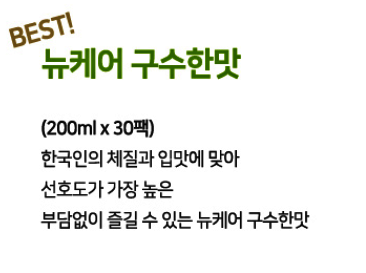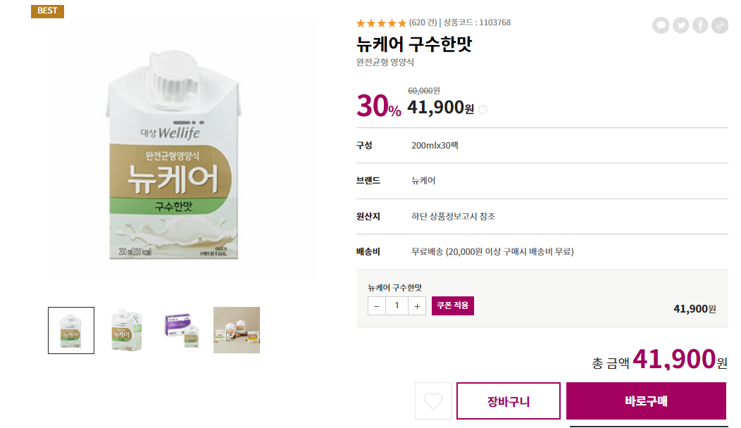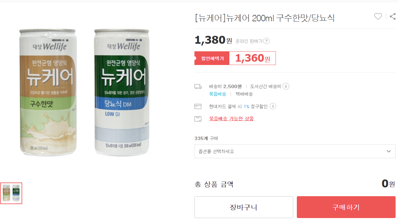 뉴케어 구수한맛은 대상 웰라이프 홈페이지(wellife.co.kr)에 접속하여 구매하실 수 있는데요, 가격은 200ml x 30팩에 41,900원에 판매되고 있습니다.
