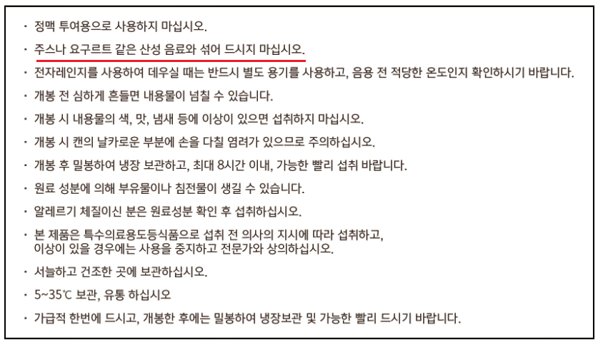 섭취 시 주의사항으로는 주스나 요구르트와 같은 산성 음료와는 섞어 드시지 않는 것이 좋습니다!