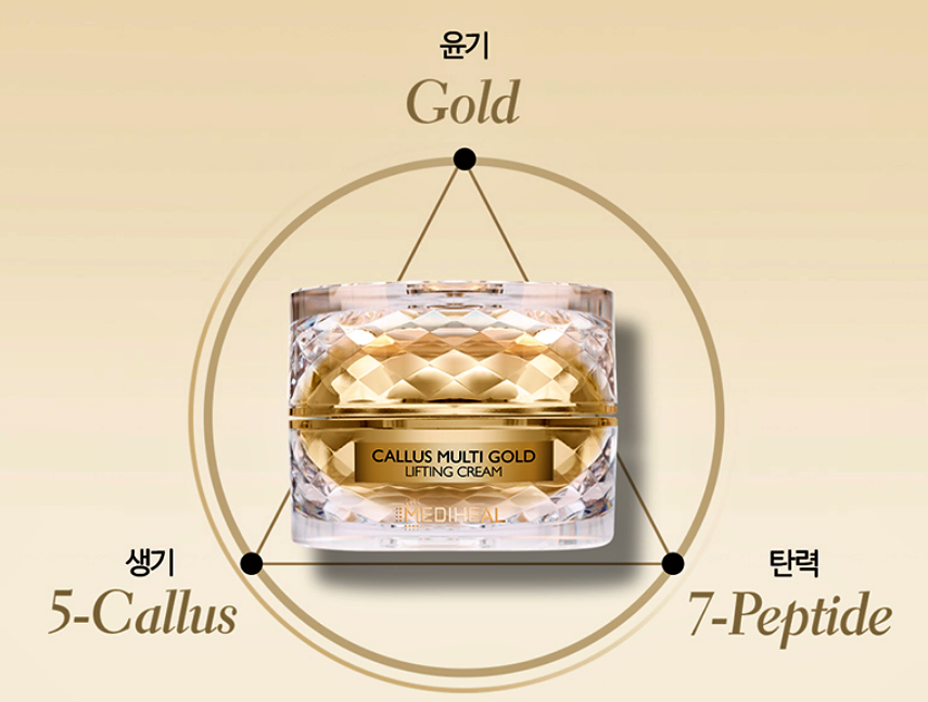 메디힐 캘러스 멀티 골드 리프팅 크림에는 골드(Gold) 성분과 식물 줄기세포 추출물이 함유되어 있습니다.