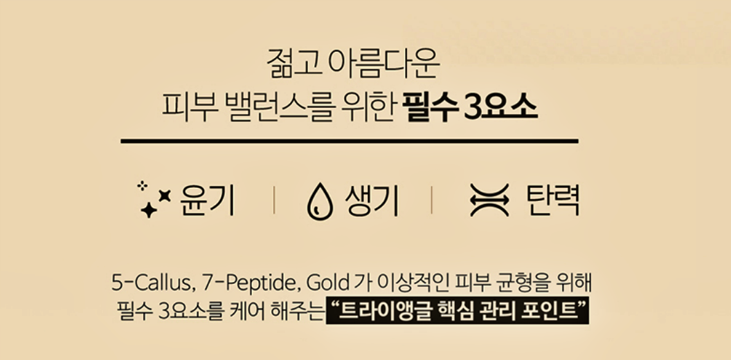 또한 7종의 펩타이드와 5-Callus(록샘파이어, 녹차, 씨사이드에링고, 다마스크 장미, 인삼)이 함유되어 있는데 골드 성분과 적절한 비율로 배합되어 이상적인 피부 밸런스를 맞추는데 정말 효과적인 화장품이라고 하네요 :)