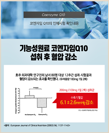 호주 의과대학 연구진의 80명 남녀를 대상으로 12주간 코엔자임Q10 원료를 섭취(투여용량 100mg, 1일 2회씩)하게 한 결과 혈압이 감소됐다는 효과를 확인했습니다.