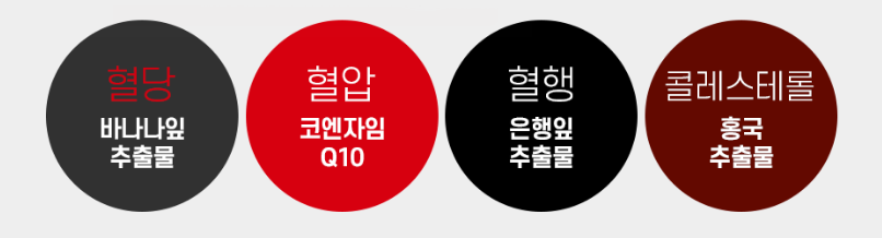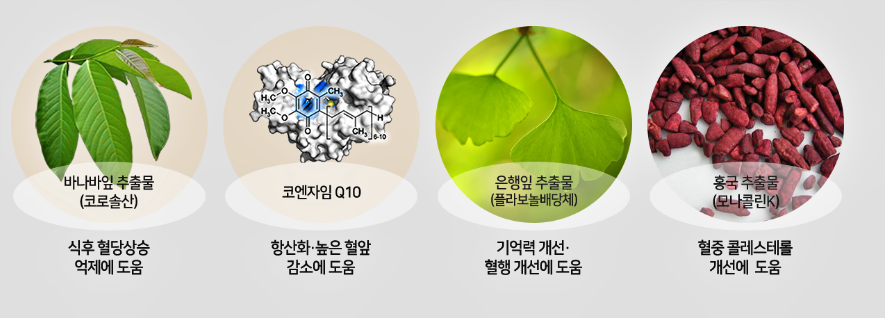 뿐만 아니라 혈압을 억제해주고, 항산화 작용에 뛰어난 효과가 있는 코엔자임 Q10 / 기억력 개선과 혈행 개선에 도움을 줄 수 있는 은행잎 추출물(플라보놀배당체) / 중성지방 및 나쁜 콜레스테롤(LDL)과 결합된 콜레스테롤 농도를 저하시켜 혈행 개선에 도움을 줄 수 있는 홍국 추출물(모나콜린K)가 적절하게 배합되어 있습니다.