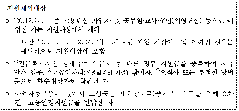 하지만 20.12.15 ~ 12.24 내 고용보험 가입 기간이 3일 이하인 경우에 한 해서는 예외적으로 지원대상에 포함되니 이 점 참고하시기 바랍니다.