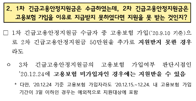하지만 20.12.15 ~ 12.24 내 고용보험 가입 기간이 3일 이하인 경우에 한 해서는 예외적으로 지원대상에 포함되니 이 점 참고하시기 바랍니다.