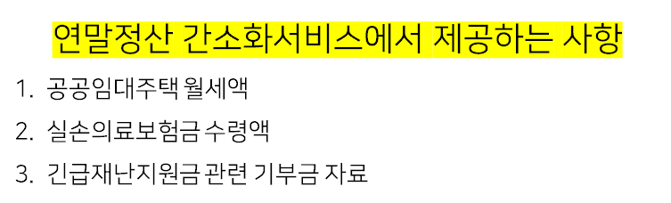 단, 연말정산 간소화 서비스에서 제공하지 않는 자료도 있으니 이 점은 따로 직접 수집해서 제출하시기 바랍니다.