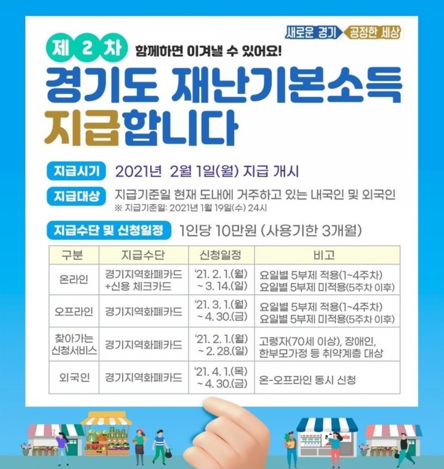 경기도에 거주하는 외국인 분들이 많은 것으로 아는데, 이번 2차 재난지원금에는 신청이 가능하니 이 점 참고하시면 좋을 것 같습니다.