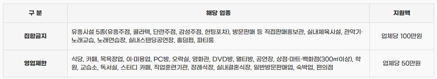 집합금지 업종과 영업제한 업종은 아래 표를 참고하시기 바랍니다.