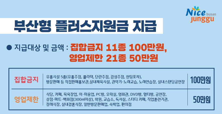 이번 부산 플러스지원금은 집합금지 업종(11종)에 100만원, 영업제한 업종(21종)에 50만원을 각각 지급합니다.