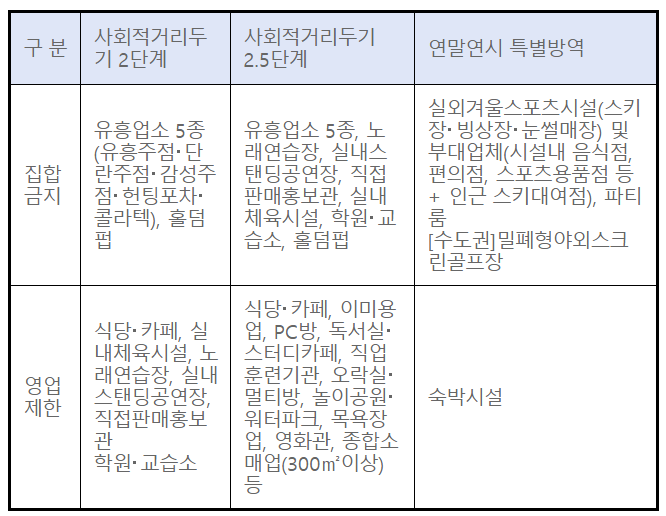 집합금지 업종과 영업제한 업종은 아래 표를 참고하시기 바랍니다.
