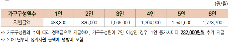 4인 가족 기준 1,304,900원을 지급하고 1인 가구부터 6인 가족 최대 1,773,700원을 받을 수 있습니다.