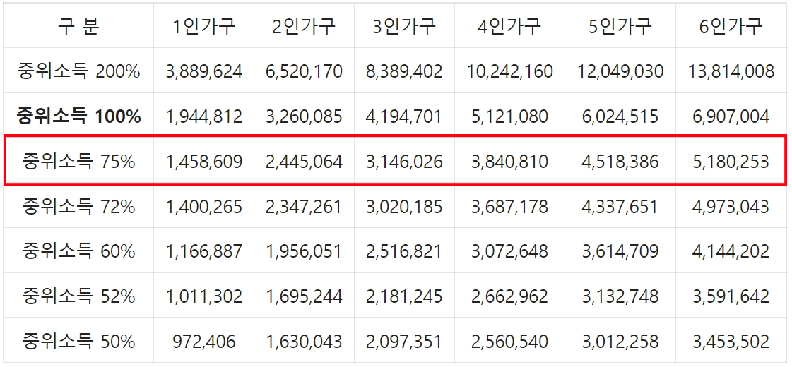 소득 기준은 기준 중위소득 75%(1인 기준 1,458,609원, 4인 기준 3,840,810원) 이하일 경우 선정 대상에 포함됩니다.