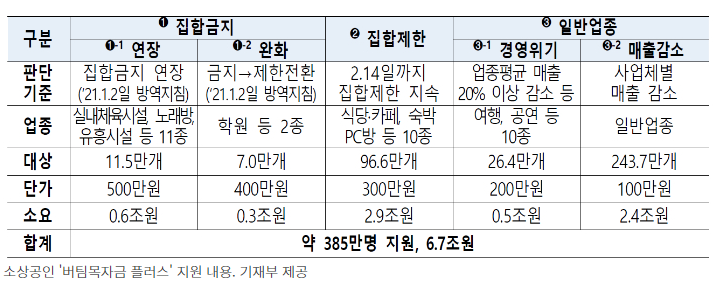 계속 영업금지였던 업종에는 500만원, 영업금지에서 제한으로 전환된 업종에는 400만원, 계속 영업제한이던 업종에는 300만원이 각각 지급됩니다. 또한 일반업종에도 100만~200만원이 지급될 예정입니다.