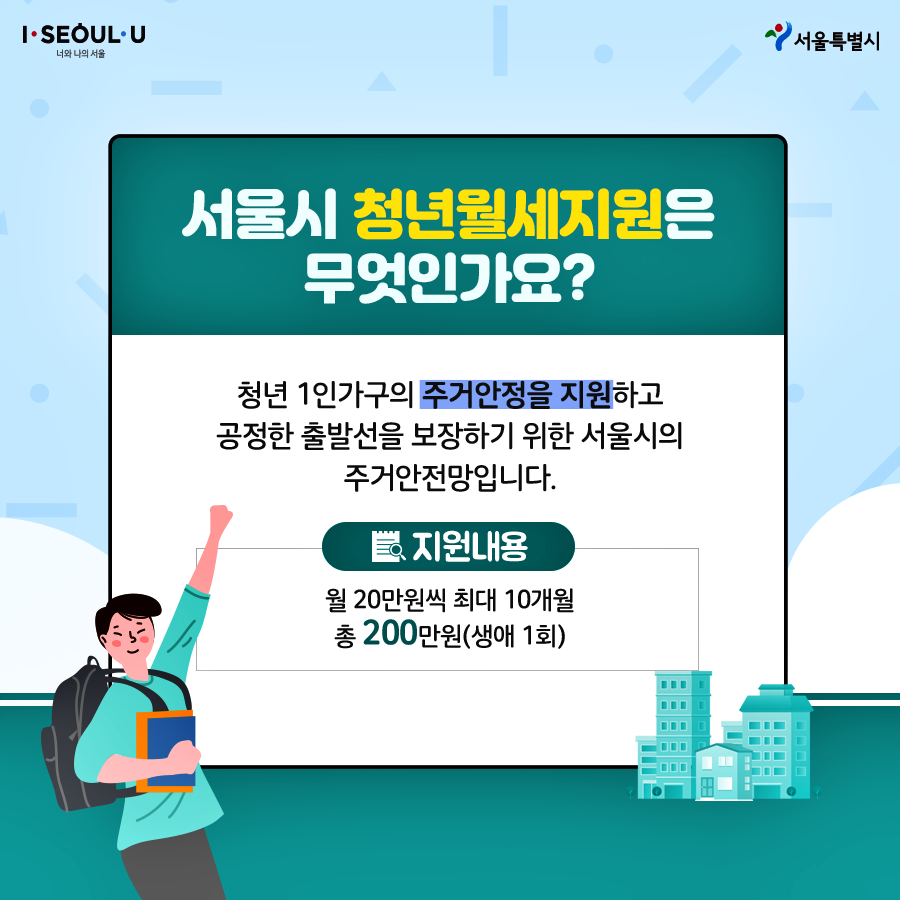 서울 청년월세지원은 만 19세~39세 서울에 거주하는 청년 1인 가구에 월 20만원의 월세 최장 10개월 동안 지원하는 사업입니다.