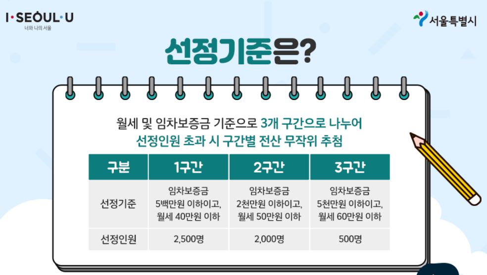 이번 청년월세지원금 수혜 대상 선정은 월세 및 임차보증금 기준으로 1~3 구간 총 3개 구간으로 나누어 각 구간의 선정인원을 초과하여 지원했을 경우 구간별 전산 무작위 추첨으로 진행됩니다.