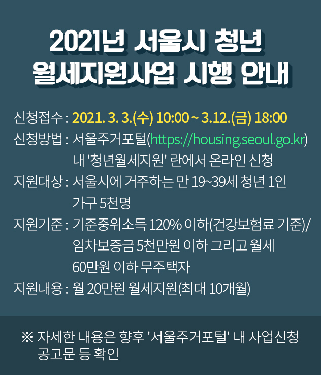 오늘은 3월부터 시작되는 2021년 서울시 청년 월세지원사업 시행 관련해서 관련 정보를 전달해드리고자 합니다.