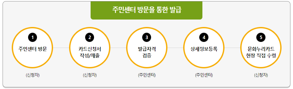 주민센터 방문 > 카드신청서 작성 및 제출 > 발급자격 및 조건 확인 > 상세정보 등록 > 문화누리카드 현장 수령