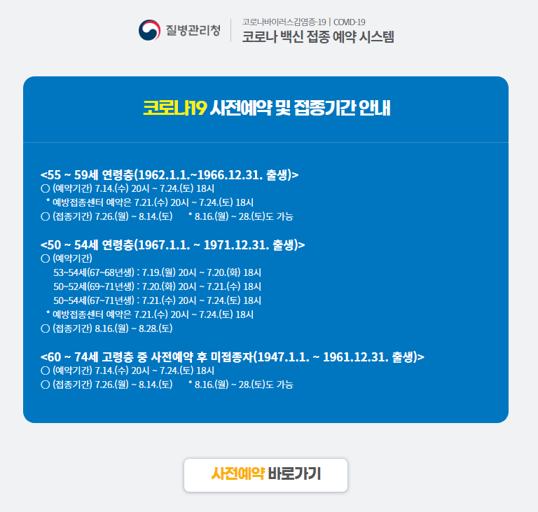 7월 26일부터 내달 8월 7일까지는 만 55∼59세(1962∼1966년 출생자) 백신 접종이 시작되는데요, 이들은 모더나 백신을 맞게 됩니다. 사전예약 기간은 7월 12∼17일입니다.