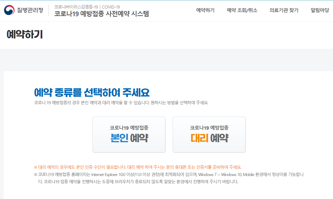 사이트에 접속하면 아래와 같은 화면이 뜨게 되는데 '사전예약 바로가기'를 클릭하신 후 '본인예약' or '대리예약' 중에 하나를 선택합니다. 본인이 직접 예약을 진행한다면 본인예약, 가족분이 예약을 대신 해주신다면 대리예약을 누르시면 됩니다.