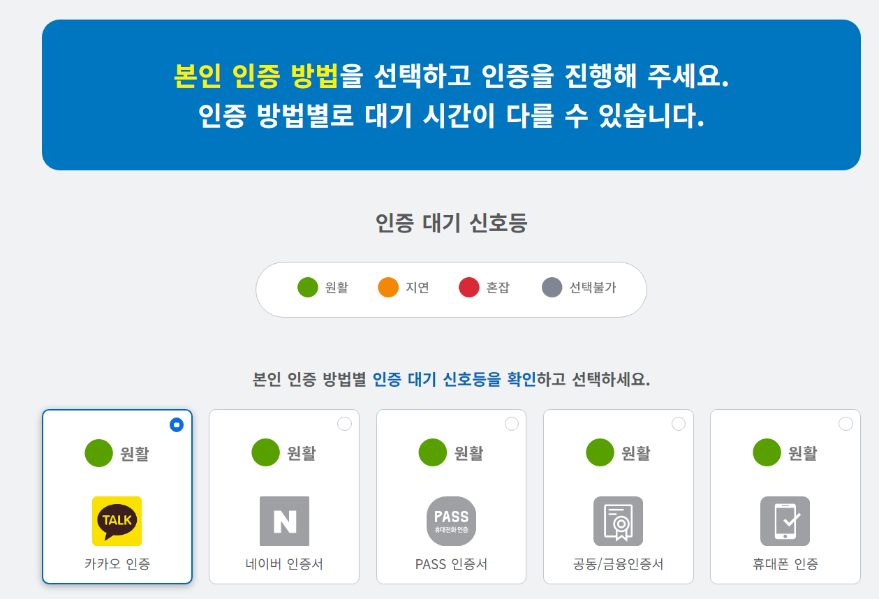 본인인증은 카카오톡 / 네이버 / PASS / 공동인증서 / 휴대폰인증이 가능한데 개인적으로는 공동 / 금융인증서가 가장 빠른 것 같더라구요!