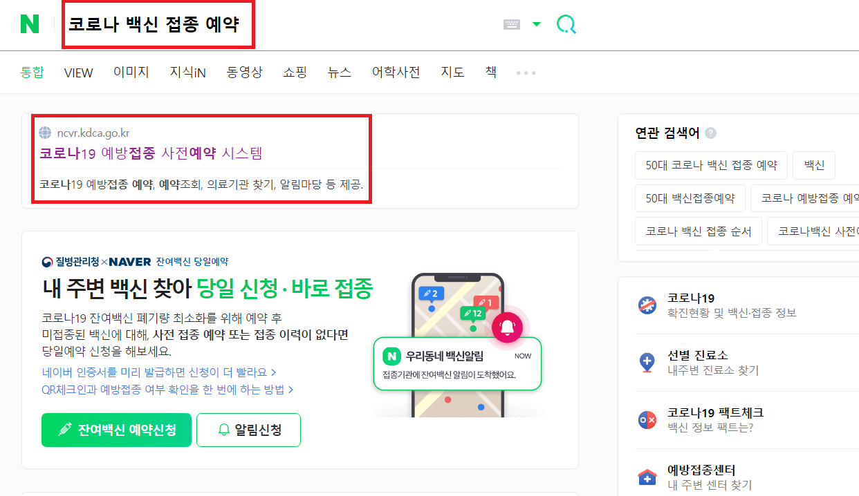 코로나 백신 접종 예약을 위해서는 우선 네이버에 '코로나 백신 접종 예약'을 검색합니다.