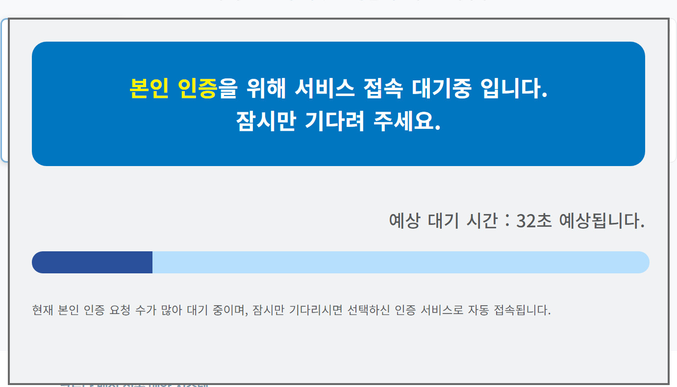 그래서 중간에 취소하고 공동인증서로 인증하니 5초만에 되더라구요 :)