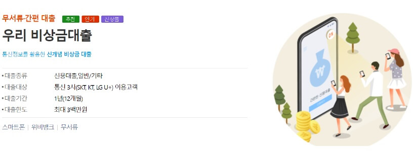우리은행 비상금 대출도 농협 올원 대출과 마찬가지로 통신등급을 활용하여 무직자도 누구나 쉽게 대출 받을 수 있는 서비스입니다.