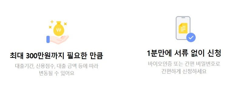 현행법상 300만원 이상의 돈을 빌려야 할 때는 소득을 증빙해야 하는데, 300만원 까지는 이러한 절차 없이 모바일로 누구나 쉽게 대출을 받을 수 있습니다.