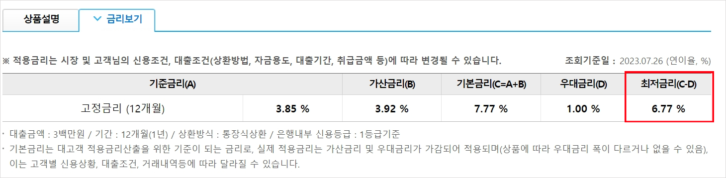 기본 금리는 7.77% 이지만 우대 금리를 최대 1%까지 적용 받으면 6%대에 비상금대출을 받을 수 있습니다.