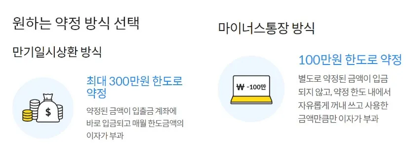 약정방식은 만기일시상환 방식과 마이너스 통장 방식이 있는데, 둘 중 더 유리한 방식으로 택1 하시면 됩니다.