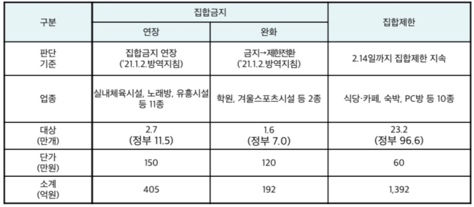 집합금지 업종은 150만 원을 받을 수 있고, '집합제한' 업종은 60만 원을 차등 지원 받습니다.