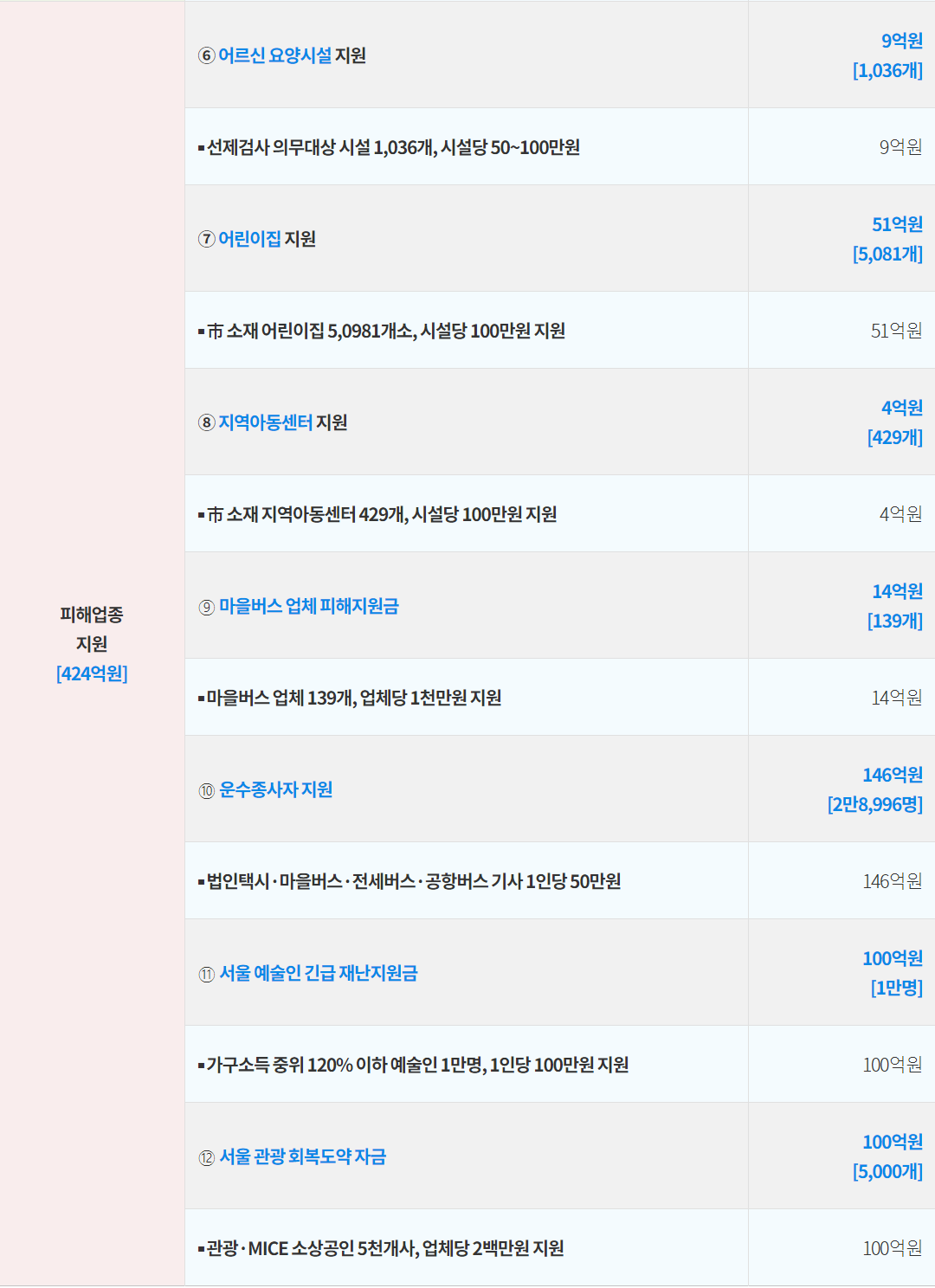 지역아동센터, 재택근무 확대 등으로 승객이 줄어 자금난을 겪고 있는 마을버스 운수종사자, 사회적 거리두기 강화로 시설 운영에 차질을 겪고 있는 어르신 요양시설 등 피해가 가중되고 있는 업종과 시설도 이번 위기 재난 지원금 지급 대상에 포함됩니다.