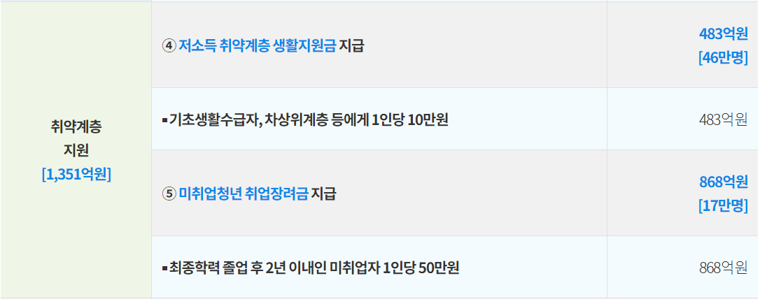 기초생활수급자(국가형‧서울형), 차상위계층, 법정 한부모가족은 1인당 10만 원을 현금으로 지급 받을 수 있습니다.