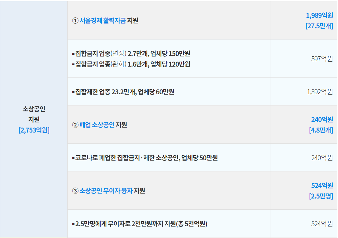특히 서울은 전국 타 지역에 비해 확진자 수가 장기간 높게 지속돼서 영업피해도 비교적 컸고, 고정 지출 비용이 높은 점을 고려해 보다 두터운 지원과 정부 지원이 미치지 못한 사각지대까지 꼼꼼히 지원한다는 계획입니다.