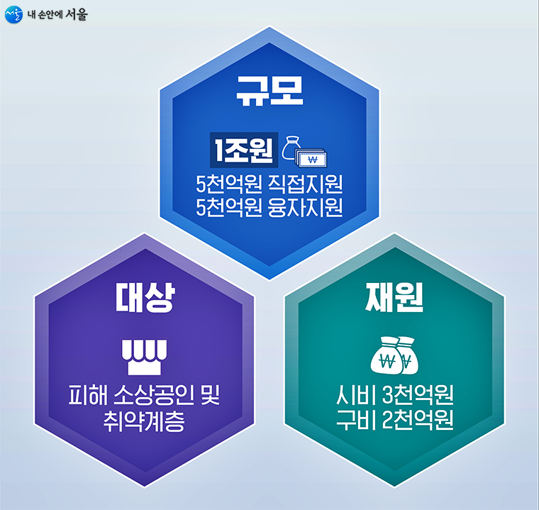 서울시는 25개 자치구와 함께 5,000억 원(25개 자치구가 2,000억 원을, 서울시가 3,000억 원)을 투입해 ‘위기극복 재난지원금’을 지원합니다.