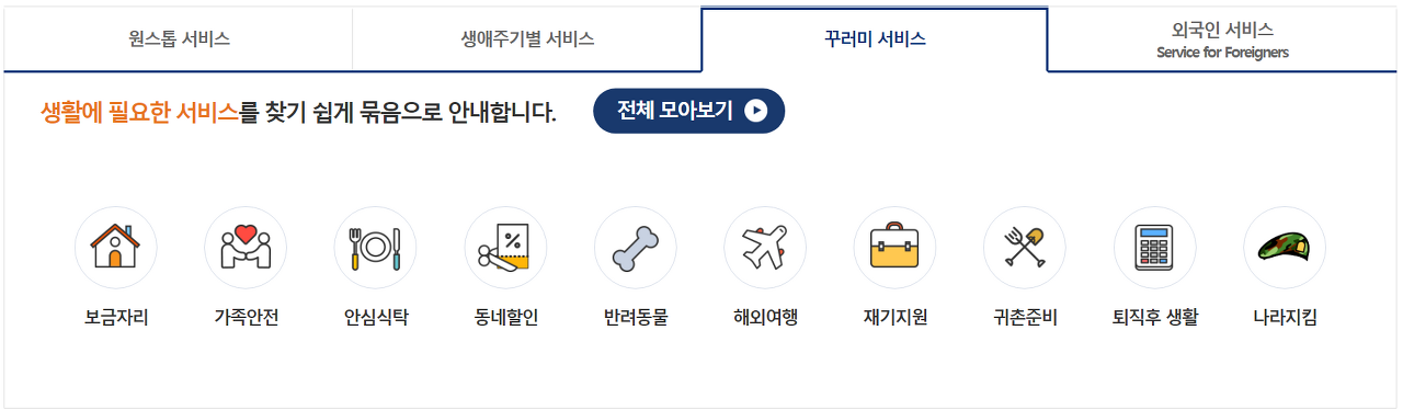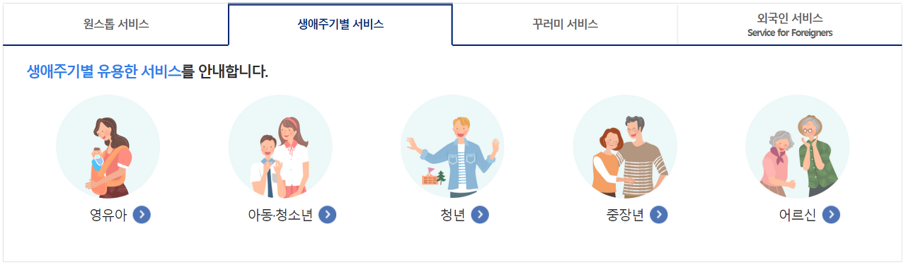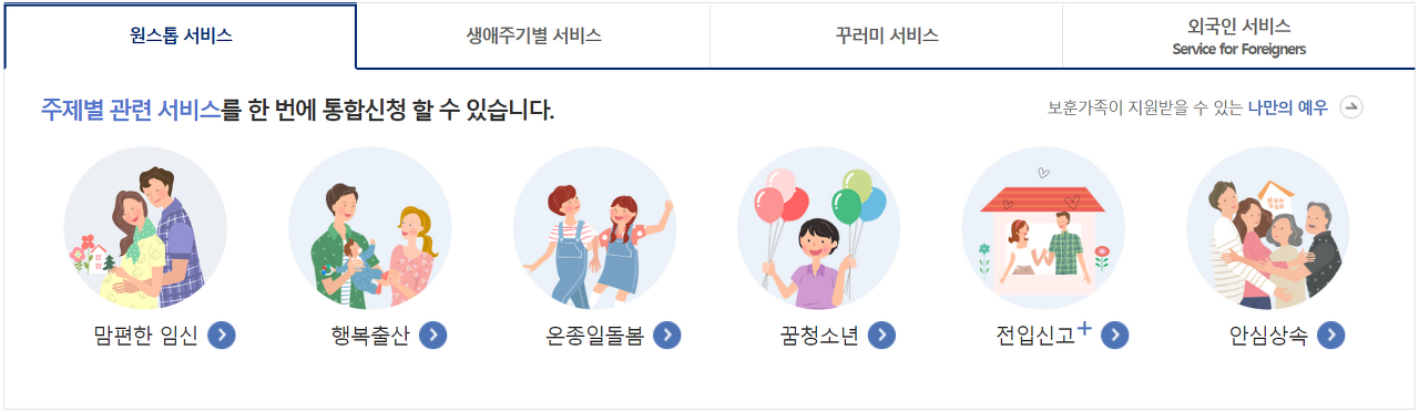 보조금 24는 크게 원스톱 서비스 / 생애주기별 서비스 / 꾸러미 서비스 / 외국인 서비스 4가지로 서비스로 나뉩니다.