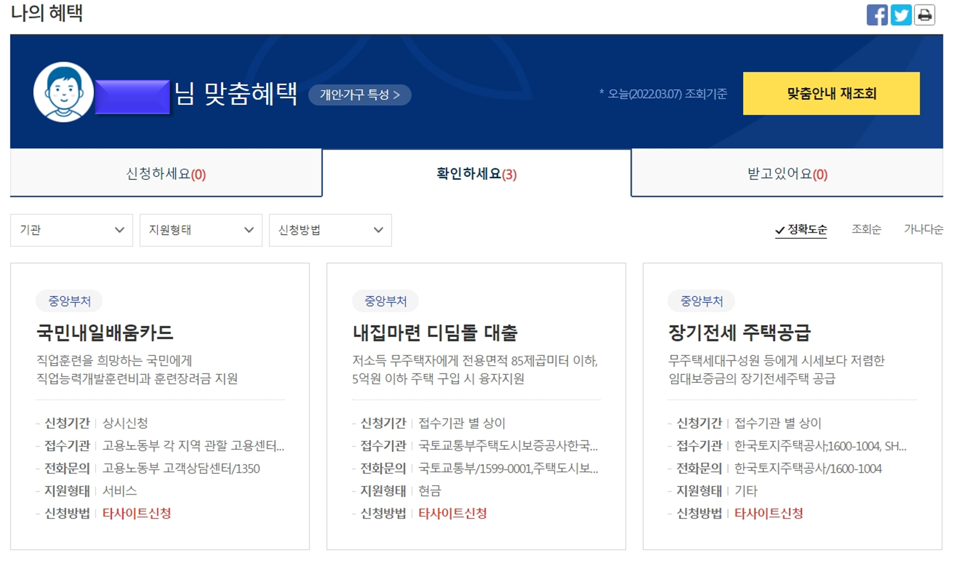 3. 현재 내가 받을 수 있는 '정부혜택'을 확인하고 신청하면 완료!