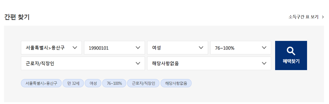 본인이 거주하시는 곳과 생년월일, 성별, 소득구간, 직업군을 입력하신 후에 '혜택찾기'를 누르시면 보다 많은 정부 혜택을 찾으실 수 있습니다.