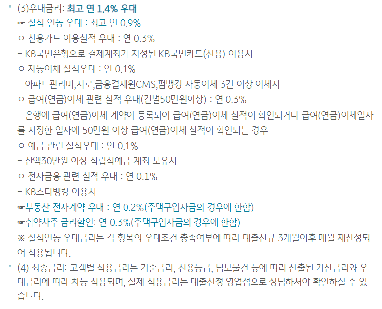 여기에 추가로 혜택을 보기 위해서는 우대금리를 적용 받는 것이 중요한데요, 실적, 전자계약, KB스타뱅킹 등을 이용하면 연 최대 1.4% 우대금리를 적용 받을 수 있으니 이 점 참고하시기 바랍니다.