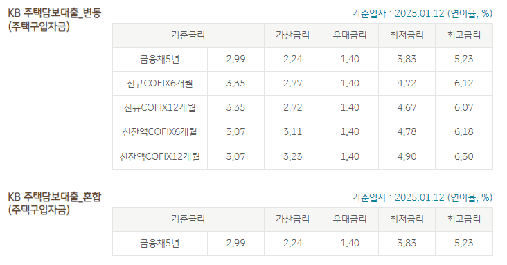 국민은행 주택담보대출의 2025년 1월자 금리는 다음과 같습니다.