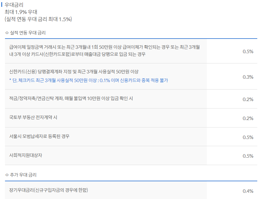 급여이체 일정금액 거래시 OR 최근 3개월 내 1회 50만원 이상 급여이체가 확인되는 경우 0.5% / 신한카드 최근 3개월 사용실적이 50만원 이상일 경우 0.3% / 적금 청약저축 연금시탁 계좌, 매월 불입액 10만원 이상 입금 확인 시 0.2% / 국토부 부동산 전자계약 시 0.2% / 서울시 모범납세자로 등록된 경우 0.5% / 사회적 지원 대상자의 경우 0.5% / 장기우대금리 0.4 등의 우대금리가 적용됩니다.